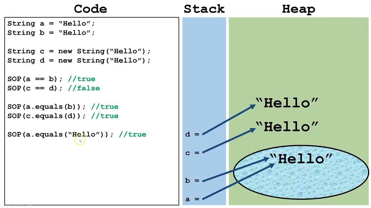 String y = "Hello";identical string objects created this way points to the same location in memoryString z = new String ("Hello");identical string objects created this way create new strings each time in memory